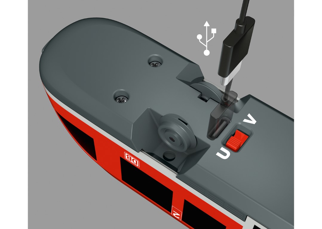 Modell: Zug mit Akkuantrieb und Magnetkupplungen zwischen den beiden Zugteilen. Motor, Akku und die gesamte Elektronik sind im motorisierten Zugteil für Kinder unzugänglich verbaut. Der Zug kann mit dem mitgelieferten Ladekabel aufgeladen werden. Der zweite Zugteil sorgt durch das abnehmbare Dach und die Inneneinrichtung für vielerlei Spielmöglichkeiten. Jeweils 3 Geschwindigkeitsstufen bei Vorwärts- und Rückwärtsfahrt, sowie 3 Soundfunktionen und ein Zweilicht-Spitzensignal, sind über das kindgerechte Infrarot-Fahrgerät steuerbar.Länge des Zuges 32,6 cm.Inhalt: 16 gebogene Kunststoffgleise, 10 gerade Gleise, 1 Weiche links und 1 Weiche rechts. Kindgerechter, kabelloser Märklin Power Control Stick. Ladekabel und 2x AAA Batterien im Lieferumfang enthalten. Zudem liegt ein Stickerbogen mit verschiedenen ausländischen Bahngesellschaften zum Bekleben des Zuges bei. Erweiterbar mit der Kunststoffgleis-Ergänzungspackung 23400.