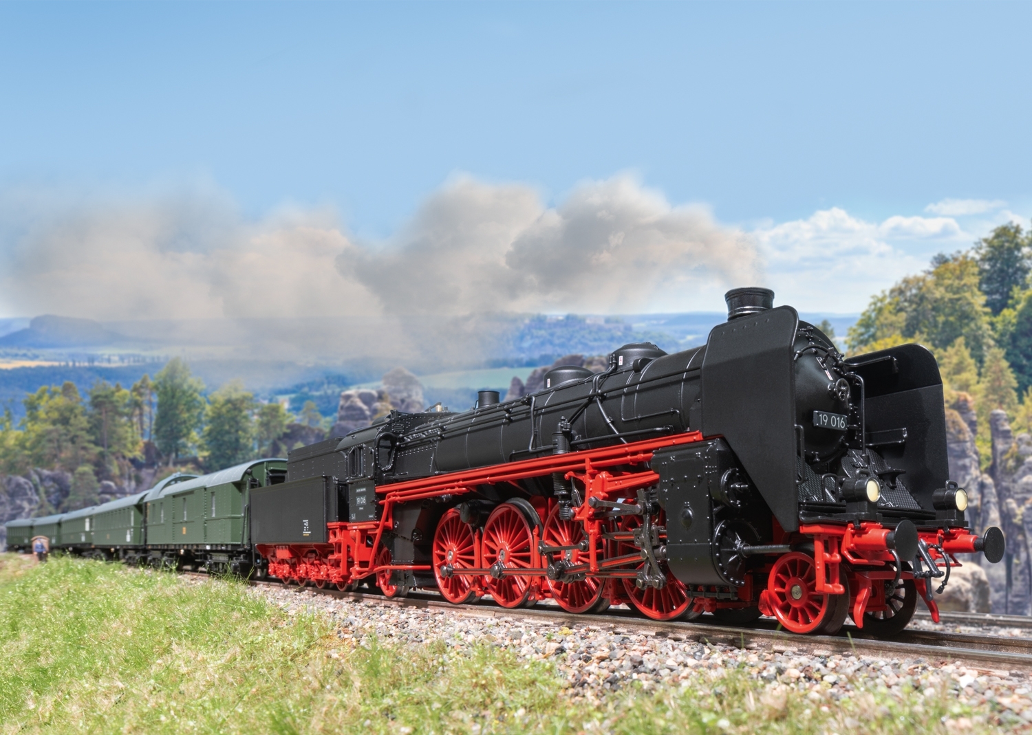 Vorbild: Schnellzug-Dampflokomotive Baureihe 19.0 "Sachsenstolz" (Sächsische Gattung XX HV), mit sächsischem Kohlen-Schlepptender 2´2 T31. Deutsche Reichsbahn der DDR (DR/DDR). Mit großen Windleitblechen. Lok-Betriebsnummer 19 016. Betriebszustand Epoche IIIa, Anfang der 1950er Jahre.