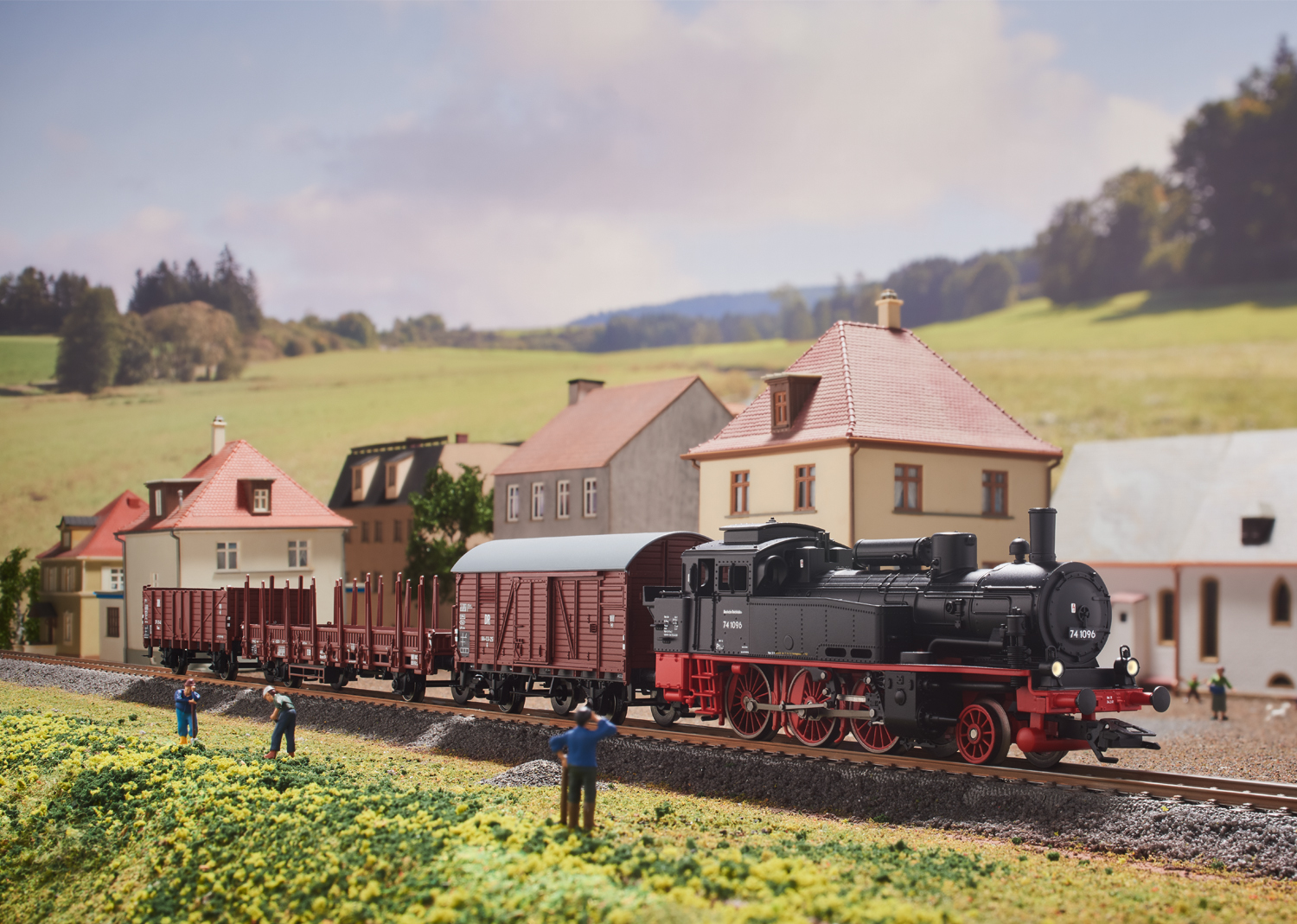 Vorbild: Tenderlokomotive Baureihe 74, ein offener Güterwagen der Verbandsbauart Omu und ein gedeckter Güterwagen der Austauschbauart GR der Deutschen Reichsbahn (DR) sowie ein Rungenwagen Bauart Rlmms 58 der Deutschen Bundesbahn (DB), der temporär in der DDR verwendet wurde.
