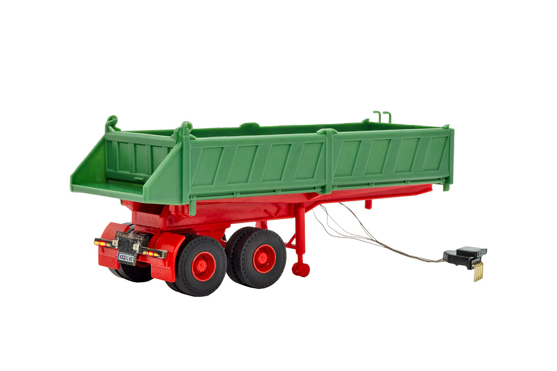 Der Auflieger mit rückwärtiger Beleuchtung verfügt über eine 5-polige Steckkupplung, um eine Verbindung zum jeweiligen Fahrzeug herzustellen. Durch den Anschluss an die Zugmaschine werden folgende Funktionen übertragen: · Infrarot-Sender für Abstandssteuerung · Bremslichter und Rückfahrscheinwerfer · Blinker rechts/links und Warnblinker steuerbar Vorbilddaten: MEILLER Kippsattelauflieger MDKS 28/2, Nutzlast ca. 22 t. L 8,8 x B 2,8 x H 3,1 – 8,2 cm