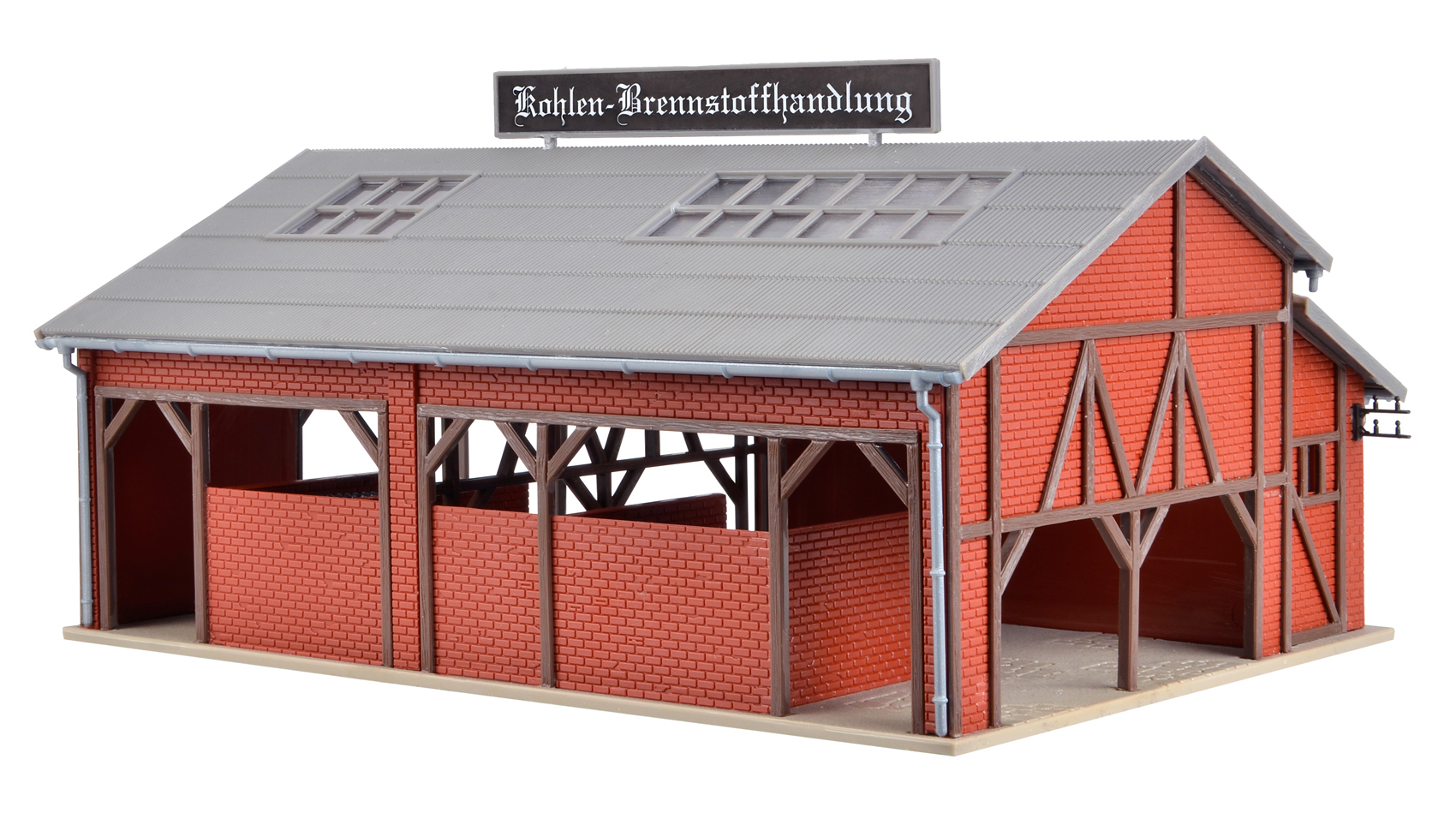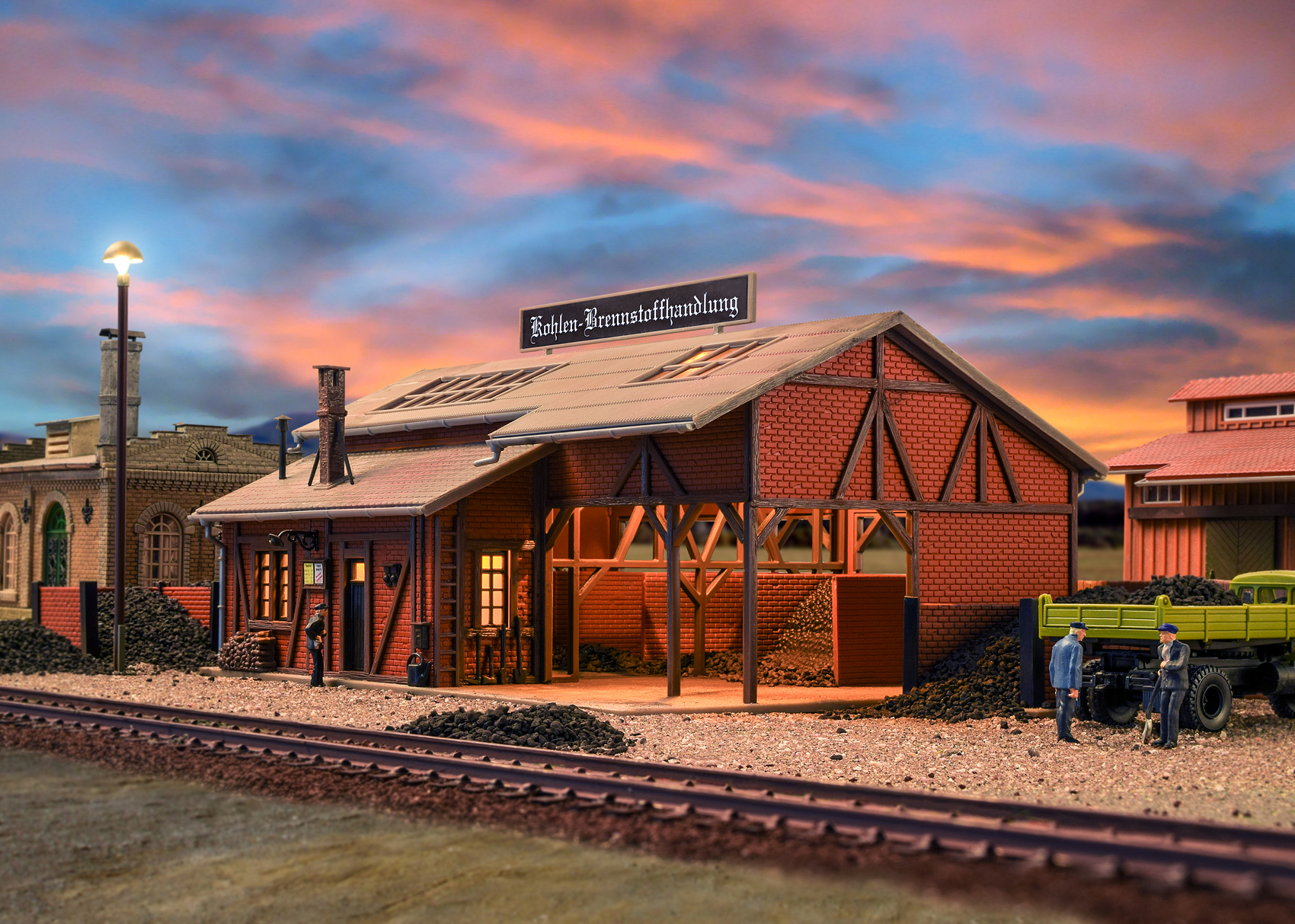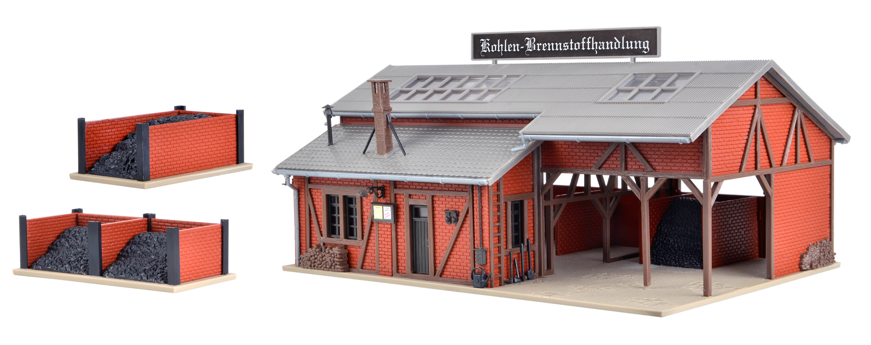 In der Kohlen- und Brennstoffhandlung wird rund um die Uhr gearbeitet. Rußgeschwärzte Gestalten verarbeiten die gerade angekommene Kohlenlieferung. Die innen- und außenliegenden Kohlebansen müssen wieder befüllt werden. In unmittelbarer Nähe zu den Gleise werden dann die Lokomotiven mit neuer Kohle versorgt. Maße: Hauptgebäude L 19,5 x B 14,5 x H 10 cm, Kohlenlager groß L 8,2 x B 4,2 x H 2,5 cm, Kohlenlager klein L 6,2 x B 4,2 x H 2,5 cm.